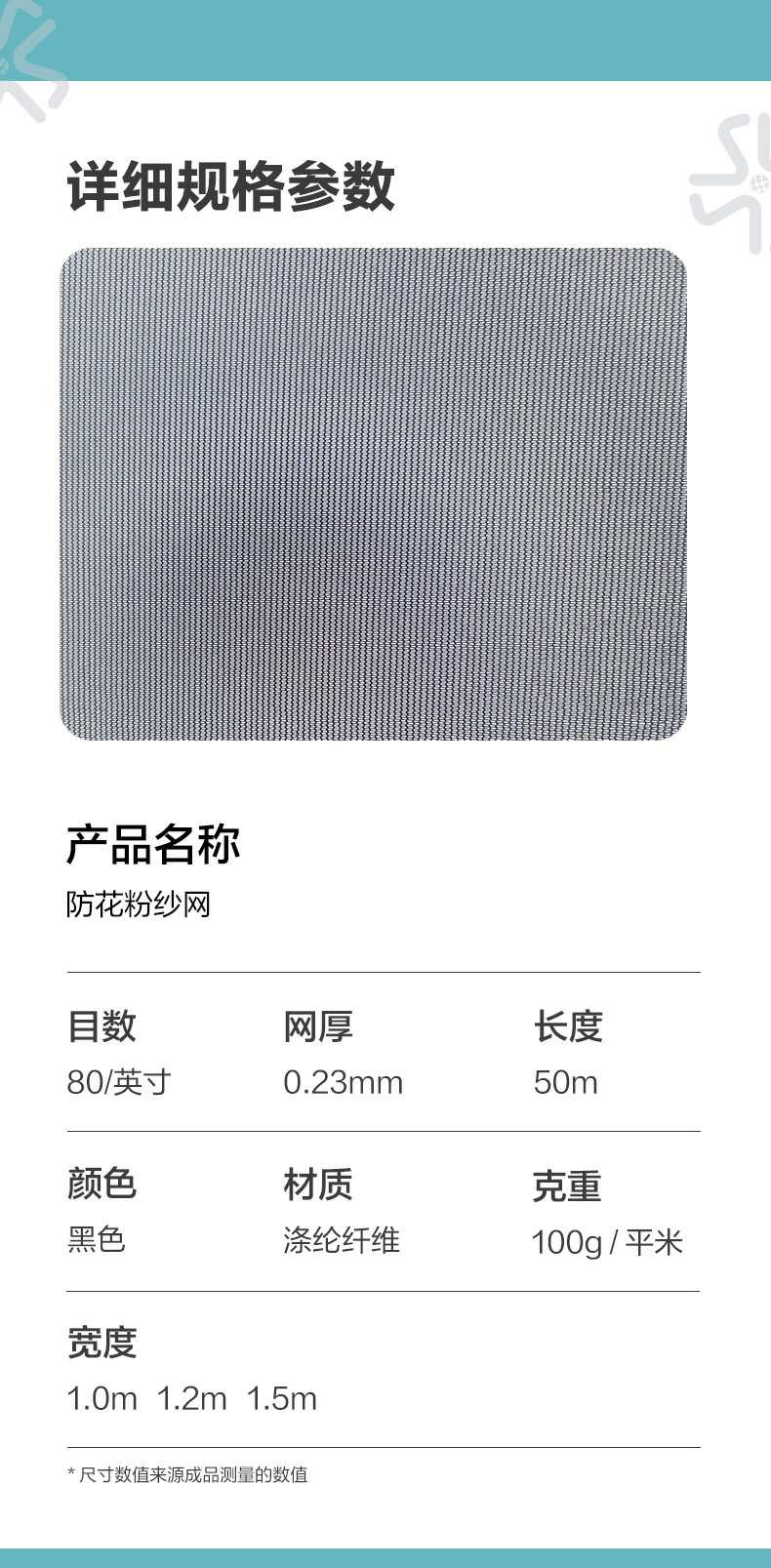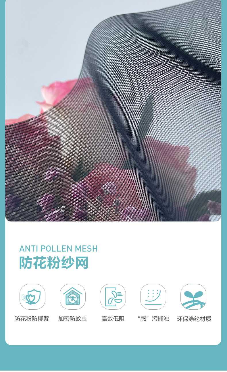 Product Features产品特点:防花粉纱网专为阻隔季节性花粉和柳絮而设计,为鼻炎患者提供额外保护。其网面经过特殊处理,增强了摩擦力和静电吸附的持久性,确保纱网能够长期有效守护居家环境。该纱网具备37%的通风率,保证室内外空气顺畅流通,同时阻隔77%的紫外线。采用高静电超细纤维丝,使其具备出色的颗粒物捕捉能力,可有效过滤尘土、花粉、柳絮、棉絮、纤维尘、雨水和风沙等微粒。这款纱网在欧美市场广受欢迎,并被用于德国新天鹅堡等知名建筑中,体现了其卓越的性能和品质。