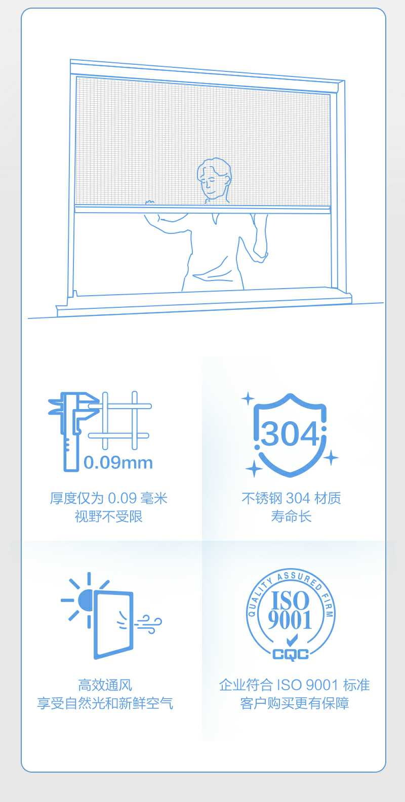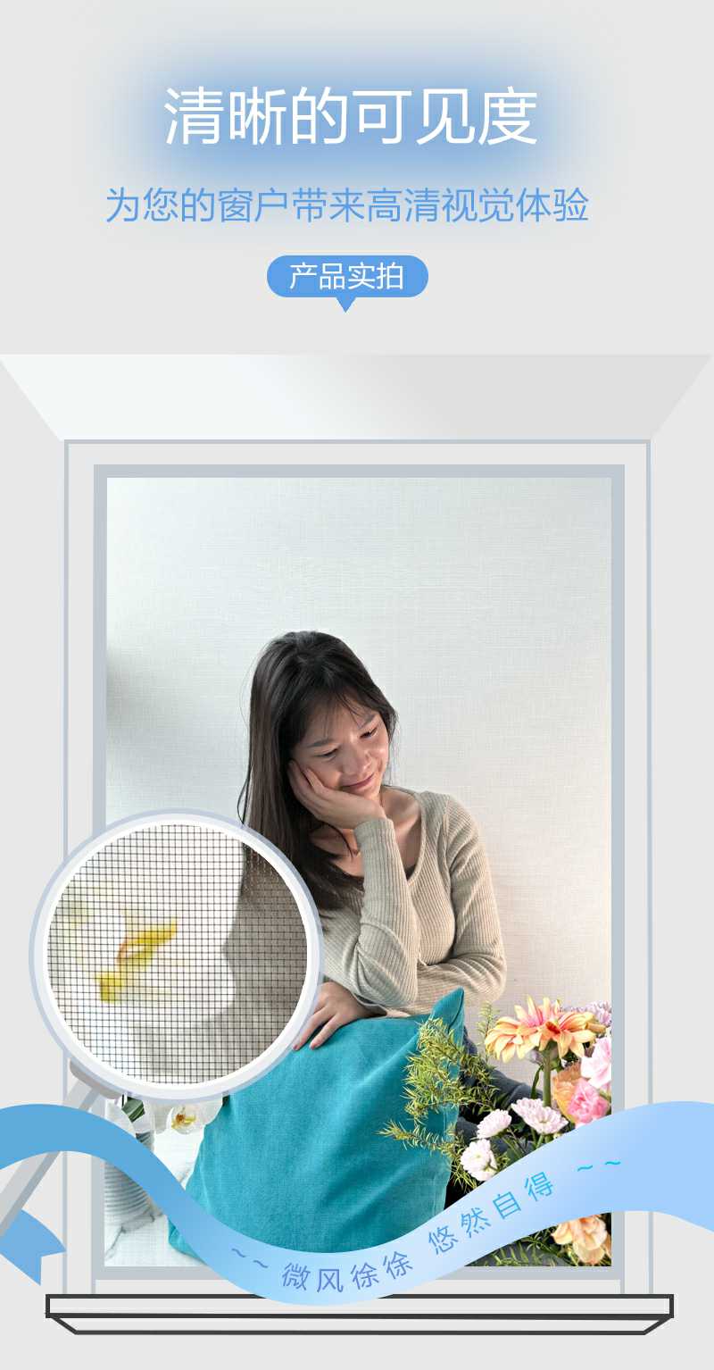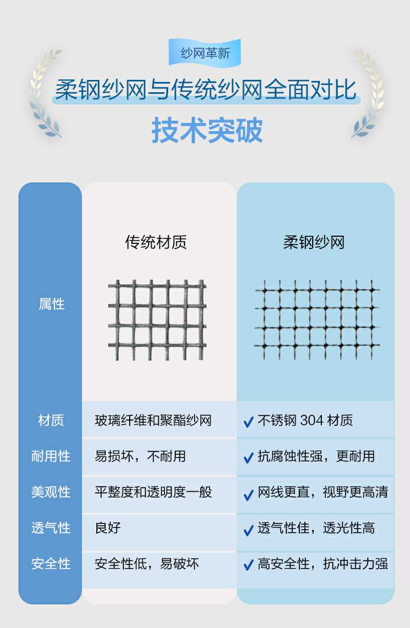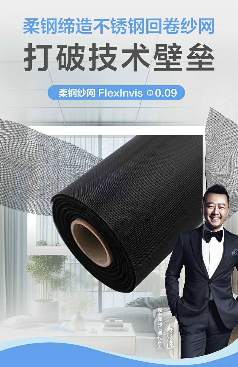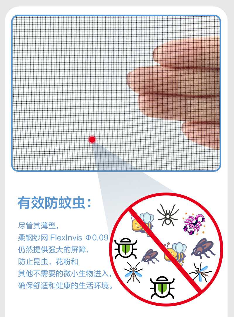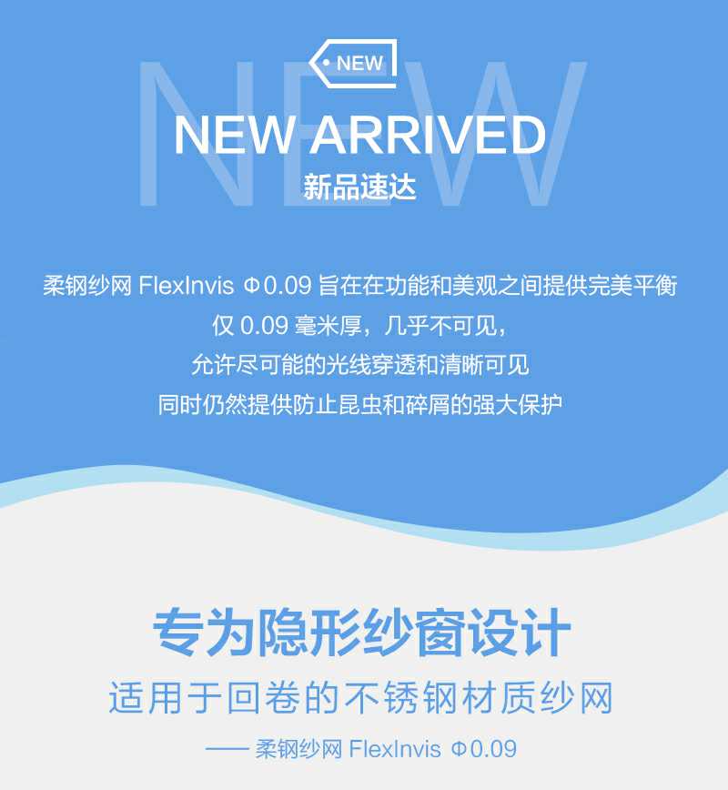 Product Features产品特点:柔钢纱网FlexInvis是一款专为隐形回卷纱窗设计的高性能金属纱网,采用0.09mm的细钢丝编织而成,具备一定的柔软性,适应回卷纱窗的需求。相较于传统使用的玻璃纤维和涤纶纱网,柔钢纱网FlexInvis凭借其金属特性,能够更容易打开市场局面,因为消费者对金属材料的认可度较高。此外,产品的延展性从原有的55%降低至15%,有效解决了热胀冷缩和拉伸后回卷纱窗回收困难的问题。其表面使用哑光千江粉末涂层,隐形效果出色,透光率与通风率都优于传统材料。更为细密的网目设计使其通风效果达到77.2%,极大提升了用户体验。