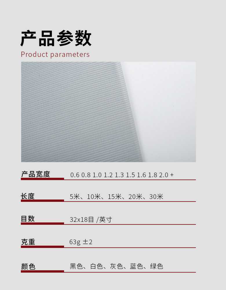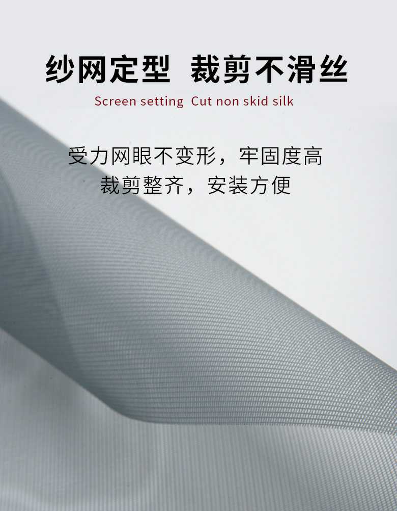 Product Features产品特点:加密聚酯纱网专为隐形回卷纱窗提供更多选择。该产品采用多股丝结构编织,并经过高温定型处理,表面附有PVC保护层,确保其在长期使用中不易下垂和老化。这些特性也使其成为折叠纱网的主要原材料。