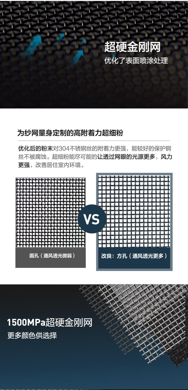 Product Features产品特点:1500MPa超硬金刚网采用超硬冷轧不锈钢材料,经过严格的测试,其平均抗拉强度为1482MPa,最高达到1503MPa,最低为1477MPa,极差仅为26MPa。与普通热轧不锈钢707MPa的抗拉强度和较大的104MPa极差相比,超硬冷轧不锈钢在编织过程中表现出更加均匀的软硬度,编织出的纱网平整度显著提升,减少了加工损耗及售后问题。该材料经过退火、酸洗、修磨等处理,最终在低温轧制下形成均匀且表面光滑的不锈钢,具备极高的抗拉强度、屈服强度和优异的松弛性能。类似的技术应用于马斯克的SPACEX飞船和CYBERTRUCK皮卡,体现了这款材料的高端与卓越性能。