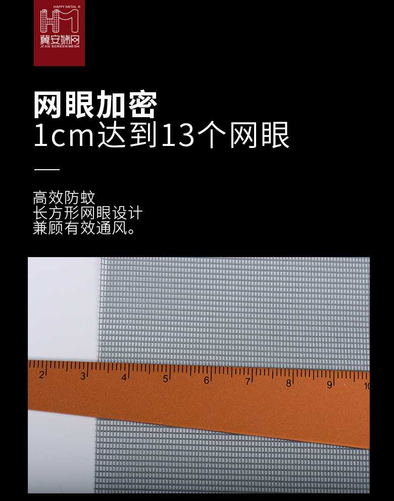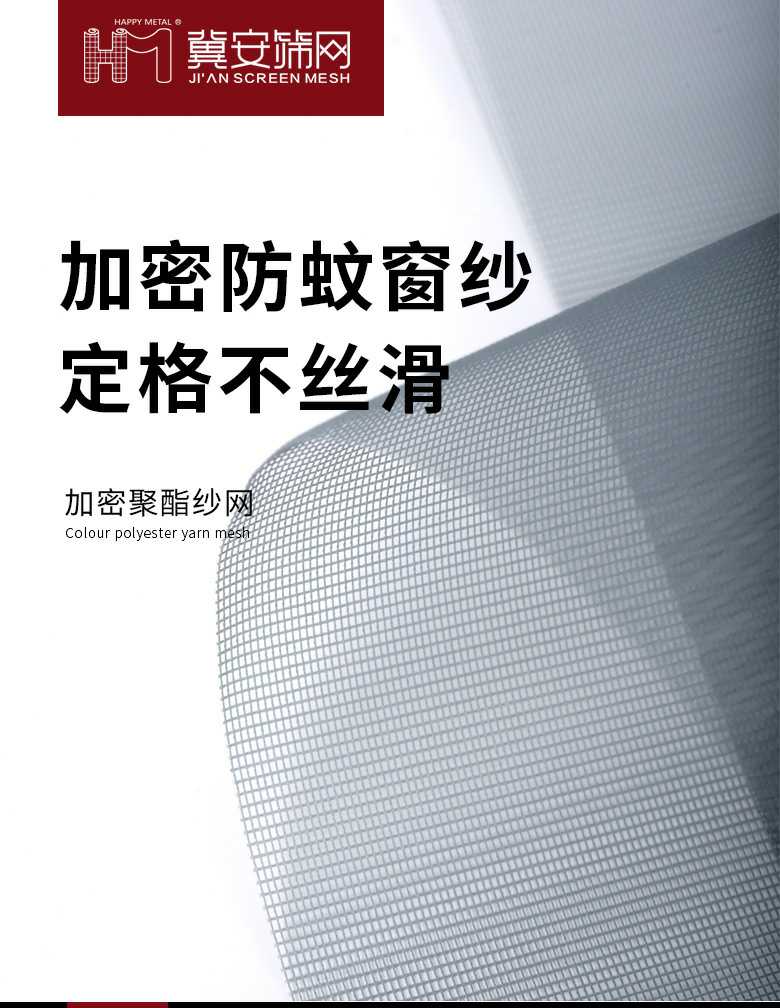 Product Features产品特点:加密聚酯纱网专为隐形回卷纱窗提供更多选择。该产品采用多股丝结构编织,并经过高温定型处理,表面附有PVC保护层,确保其在长期使用中不易下垂和老化。这些特性也使其成为折叠纱网的主要原材料。