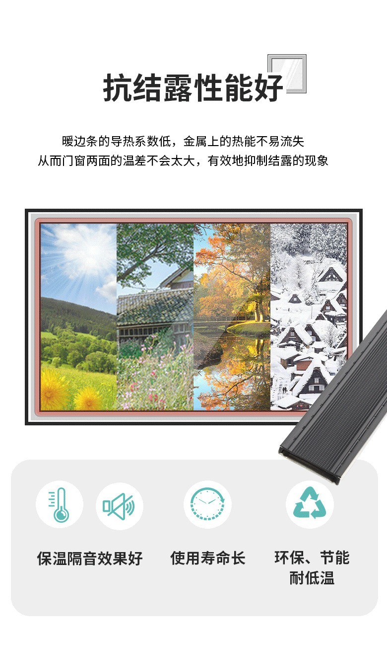 特点:AGR暖边间隔条采用行内最先进的生产设备,成熟的合片工艺,产品实现零热开胶;产品通过了最严格的TUR,罗森海姆等检测;在具备低导热特性的同时还有很高的强度,可以满足不同场合。与铝制间隔条在加工设备上具有良好的通用性。背面齿轮状设计,增加了受力,使得其不易变形,便于折弯、打胶、合片。最大限度地减少玻璃和窗户上的冷凝现象,避免间隔框的腐蚀损伤。能有效降低温度应力,大幅降低玻璃自爆率。