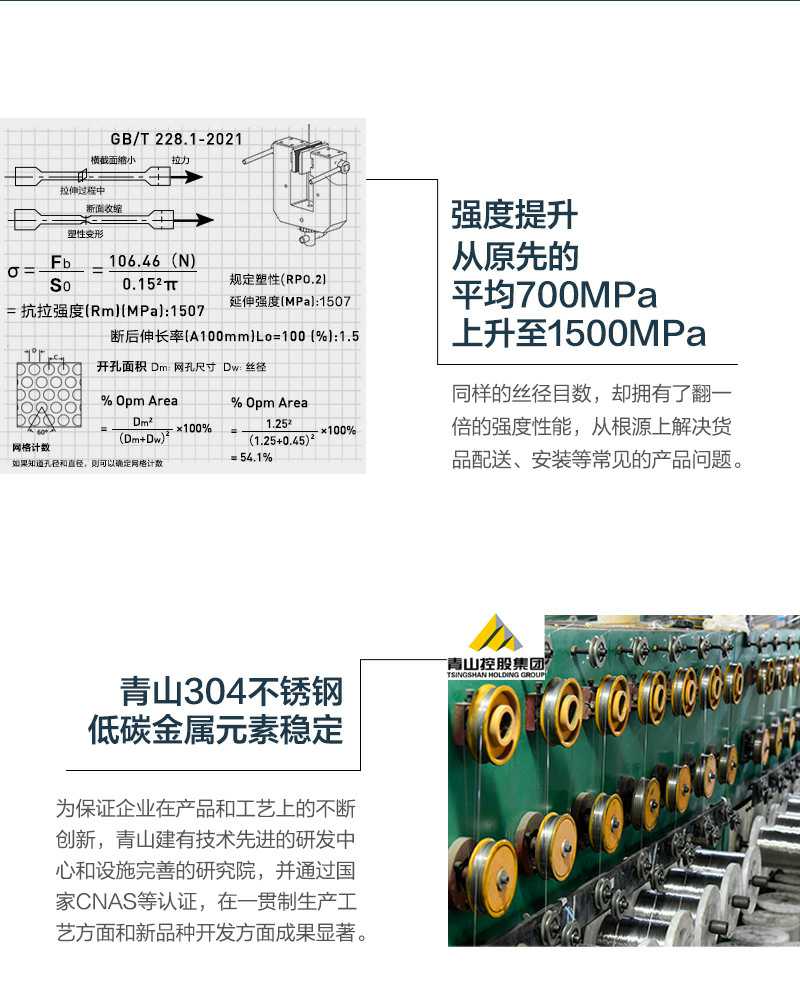 Product Features产品特点:1500MPa超硬金刚网采用超硬冷轧不锈钢材料,经过严格的测试,其平均抗拉强度为1482MPa,最高达到1503MPa,最低为1477MPa,极差仅为26MPa。与普通热轧不锈钢707MPa的抗拉强度和较大的104MPa极差相比,超硬冷轧不锈钢在编织过程中表现出更加均匀的软硬度,编织出的纱网平整度显著提升,减少了加工损耗及售后问题。该材料经过退火、酸洗、修磨等处理,最终在低温轧制下形成均匀且表面光滑的不锈钢,具备极高的抗拉强度、屈服强度和优异的松弛性能。类似的技术应用于马斯克的SPACEX飞船和CYBERTRUCK皮卡,体现了这款材料的高端与卓越性能。